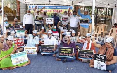 Photo Caption : Members of Aam Aadmi Party staging a protest at Freedom Park to protest against State government, in Bengaluru on Monday 14th December 2020