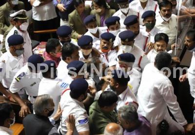 Photo Caption : Congress MLCs heckled and pushed Deputy Chairman of the Legislative Council SL Dharme Gowda from his seat during no confidence motion against Council Chairman Pratap Chandra Shetty in the Council session at Vidhana Soudha, in Bengaluru on Tuesday 15th December 2020