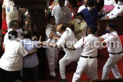 Congress MLCs and BJP MLCs arguing with the marshals during no-confidence motion against Council Chairman Pratap Chandra Shetty in the Council session at Vidhana Soudha, in Bengaluru on Tuesday 15th December 2020