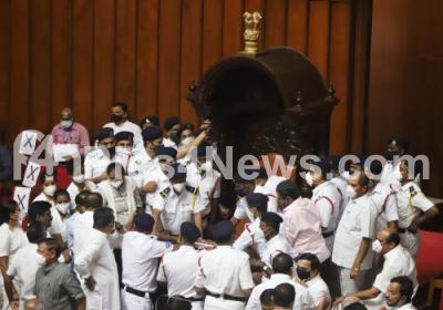 Photo Caption : Council marshals during no-confidence motion against Council Chairman Pratap Chandra Shetty in the Council session at Vidhana Soudha, in Bengaluru on Tuesday 15th December 2020