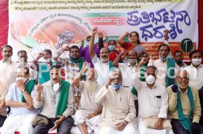 Photo Caption : Farmer leaders and Theater Activist Prasanna staging a protest at Gandhi Statue, to protest and press for repeal of the Centres agri-laws and against the Karnataka Legislative Council over the passing of contended Karnataka Land Reforms (Amendment) Bill, in Bengaluru on Thursday 17th December 2020