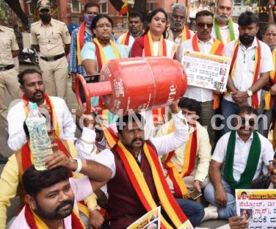 Event Description : Members of United Kannada Associations staged a protest demonstrations against steep rise in LPG and petrol prices affecting common man during Covid times, members with LPG cylinder and a member wearing PM Modi mask raise slogans against Central Government at Mysore Bank circle, in Bengaluru on Saturday 19th December 2020