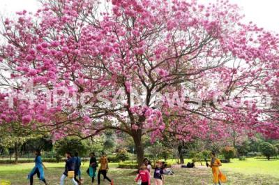 A Tabebuia tree in full bloom attracts the visitors at Cubbon Park, in Bengaluru on Saturday 19th December 2020