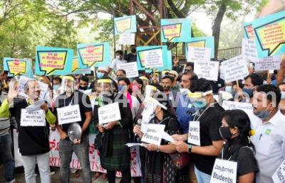 Event Description : Members of Voice of Parents Karnataka Association raise slogans against the private school management and hike of school fees, in Bengaluru on Sunday 20th December 2020