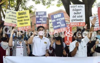 Members of SUCI raise slogans against BJP State and Central government for hike of fuel rates and BBMP garbage fees, in Bengaluru on Monday 21st December 2020