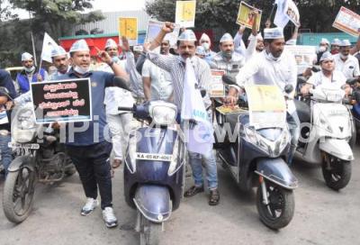 Photo Caption : Aam Aadmi Party workers pushing two wheelers to protest against BJP central government for hike in fuel price, in Bengaluru on Wednesday 23rd December 2020