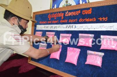 Photo Caption : A Policeman seen arranging the seized 3300 MDMA Ecstasy Tablets and 600 grams of Ecstasy Tablets Powder, worth 1 crore, were displayed during a press conference at Bengaluru City Police Commissioners Office, two Nigerians, Donchuks Okeke (Right) and Celestine Anugwe (left) were arrested at Baiyappanahalli Police Station limits, in Bengaluru on Thursday 24th December 2020