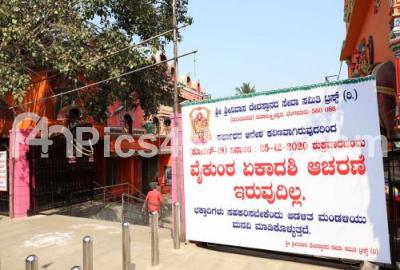 Photo Caption : No Ykunta Ekadashi celebrations notice board being displayed in front of Sri Srinivasa Temple, Mahalakshmi Pura during amid COVID-19 pandemic, in Bengaluru on Thursday 24th December 2020