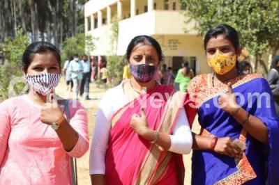 People display their inked fingers after casting their vote for the Sulikere Gram Panchayat Election at Ramasandra Poling Centre, in Bengaluru on Sunday 27th December 2020