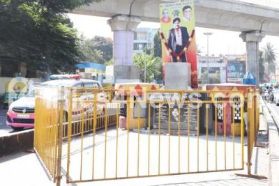 Photo Caption : Police barricade the spot where late Actor Dr. Vishnuvardan statue was removed at Tollgate, Vijayanagar, in Bengaluru on Monday 28th December 2020
