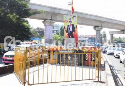 Photo Caption : Police barricade the spot where late Actor Dr. Vishnuvardan statue was removed at Tollgate, Vijayanagar, in Bengaluru on Monday 28th December 2020