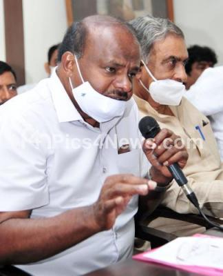 Photo Caption : JDS State President Kumaraswamy with Former CM HD Kumaraswamy, JDS Leaders Basavaraj Horatti, Nikhil Kumarswamy and others during a press conference at JDS office, in Bengaluru on Monday 4th January 2021
