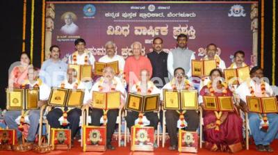 Photo Caption : MM Nandish Ancha, President, Kannada Book Authority with S Rangappa, Director Kannada and Cultural Dept., KB Kiran Singh, Administrator, Dr. Narahalli Balasubramanya and others presented Annual Awards to achievers in various fields at Ravindra Kalashetra, organised by Kannada Book Authority, in Bengaluru on Wednesday 6th January 2021
