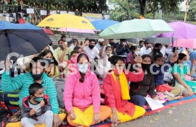 Photo Caption : Students of FDA and SDA 2017 batch staging a protest at Mourya circle to protest and demanding appointment orders to FDA and SDA students, in Bengaluru on Thursday 7th January 2021