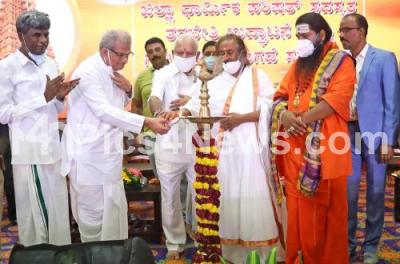 Chief Minister of Karnataka BS Yediyurappa with Spiritual Leader Ravi Shankar Guruji , Veerendra Hegde, Dharmadhikari Dharmasthala during inauguration of Religious Council members conference and Gudi paper release program at Vidhana Soudha, in Bengaluru on Thursday 7th January 2021