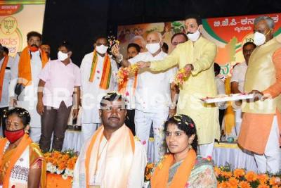 Photo Caption : Newly elected BJP Panchayat members being felicitated by CM BS Yediyurappa and BJP State President Naleen Kumar Kateel at the Jana Sevaka Samavesha , in Mysuru on Monday 11th January 2021