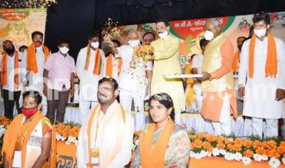 Newly elected BJP Panchayat members being felicitated by CM BS Yediyurappa and BJP State President Naleen Kumar Kateel at the Jana Sevaka Samavesha , in Mysuru on Monday 11th January 2021
