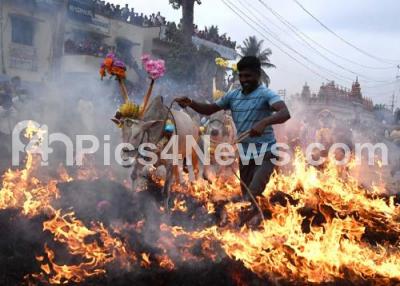 Cows jump over fire as part of "Makar Sankranti" celebrations in Mysuru on Thursday 14th January 2021