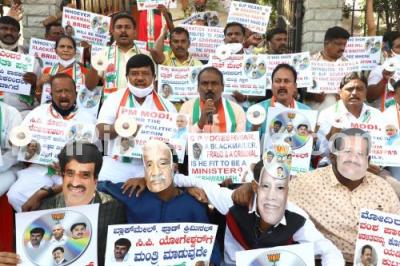 Photo Caption : Members of Bengaluru City Youth Congress protesting against BJP MLAs and demanding enquiry about BJP MLAs CD blackmail on CM BS Yediyurappa, in Bengaluru on Friday 15th January 2021