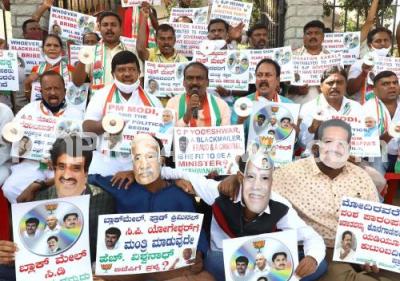 Photo Caption : Members of Bengaluru City Youth Congress protesting against BJP MLAs and demanding enquiry about BJP MLAs CD blackmail on CM BS Yediyurappa, in Bengaluru on Friday 15th January 2021