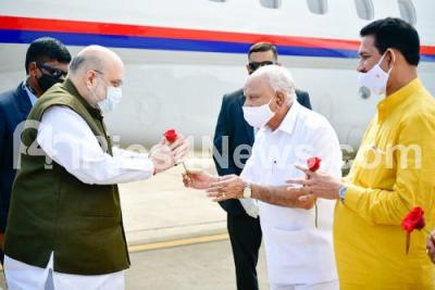 Photo Caption : Minister of Home Affairs Amit Shah being welcomed by Chief Minister of Karnataka BS Yediyurappa during his visit to Karnataka, in Bengaluru on Saturday 16th January 2021