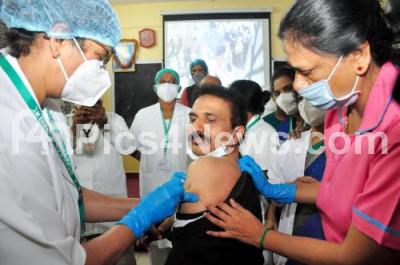 Photo Caption : Medic administers the first dose of Covishield vaccine to a Covid 19 warrior at Victoria Hospital, after the virtual launch of COVID-19 vaccination drive, in Bengaluru on Saturday 16th January 2021
