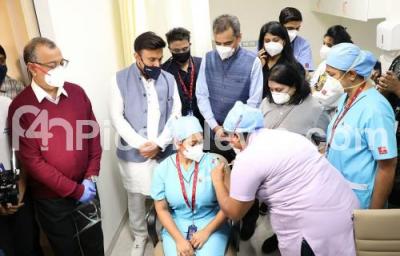 Photo Caption : Medical Education Minister K Sudhakar with r Sudarshan Ballal, Chairman Manipal Hospitals inaugurated the Covishield vaccine drive at Manipal Hospital, in Bengaluru on Sunday 17th January 2021