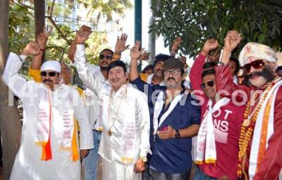 Event Description : Members of Akila Karnataka Vadyagosti Kalavidara Maha Sangha (All Karnataka Orchestra Artists Association) dressed like Kannada film actors during their protest for various demands at Gandhi Statue, Anand Rao Circle, in Bengaluru on Monday 18th January 2021