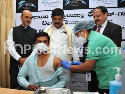 Photo Caption : Medic administers the dose of Covishield vaccine to a Covid 19 warrior in the presence of Minister Gopalaiah and Dr Bhujang Shetty, Chairman Narayana Nethralaya at Narayana Nethralaya Hospital, in Bengaluru on Monday 18th January 2021