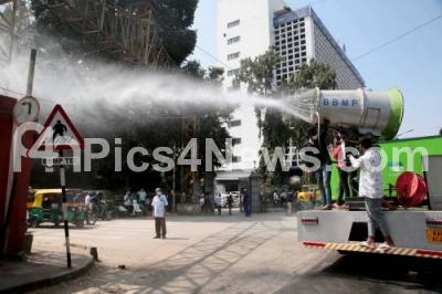 Photo Caption : BBMP fumigate SBM Circle area by using Mist Canon sprayer to combat the spread of Covid 19, in Bengaluru on Tuesday 19th January 2021