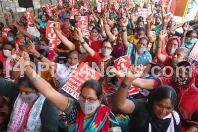 Photo Caption : Members of Karnataka Rajya Samyukta Vasathi Nilaya Karmikara Sangha (Karnataka State Federal Residential Workers Union) protesting and demanding to government to release salary from the month of June 2019, in Bengaluru on Thursday 21st January 2021