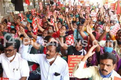 Members of Karnataka Rajya Samyukta Vasathi Nilaya Karmikara Sangha (Karnataka State Federal Residential Workers Union) protesting and demanding to government to release salary from the month of June 2019, in Bengaluru on Thursday 21st January 2021