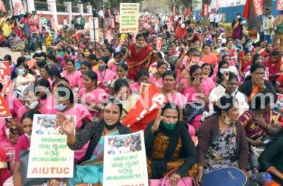 Photo Caption : Members of AIUTUC (All India United Trade Union Centre) Karnataka State Committee staging dharna to protest against the new farm laws, in Bengaluru on Friday 22nd January 2021