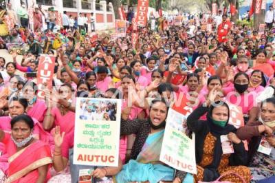 Photo Caption : Members of AIUTUC (All India United Trade Union Centre) Karnataka State Committee staging dharna to protest against the new farm laws, in Bengaluru on Friday 22nd January 2021
