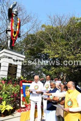 Photo Caption : Chief Minister of Karnataka CM BS Yediyurappa with Minister ST Somashekar and others paid tribute to Subhas Chandra Bose during his birth anniversary, in Bengaluru on Saturday 23rd January 2021