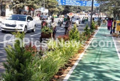Photo Caption : Workers planting the saplings on footpath at Race Course road, in Bengaluru on Monday 25th January 2021