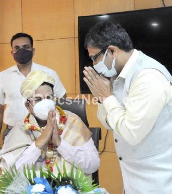 Photo Caption : Minister CC Patil being welcomed by Dr.PSHarsha Commissioner during his visits to Information Department, in Bengaluru on Saturday 30th January 2021
