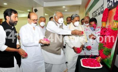 Photo Caption : CLP Leader Siddaramaiah with Congress Leaders Mallikarjuna Kharge, Saleem Ahmed, Ramalinga Reddy and others paid floral tribute to Mahatma Gandhi portrait on the occasion of his death anniversary at KPCC office, in Bengaluru on Saturday 30th January 2021