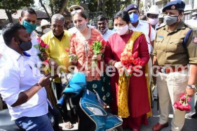 Photo Caption : Actresses Tara Anuradha, Sudharani with ACP Kavitha and Pulakeshi Nagar Traffic Police Station personnel participated in Road Safety week program, in Bengaluru on Monday 1st February 2021