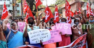 Photo Caption : Members of CITU staged a protest to fulfill their various demands at SBM Circle, in Bengaluru on Wednesday 3rd February 2021