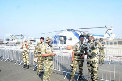 Photo Caption : Indian army stand guard at the aircraft parked at the static display area on the second day of Aero India 2021 at Yelahanka air base, in Bengaluru on Thursday 4th February 2021