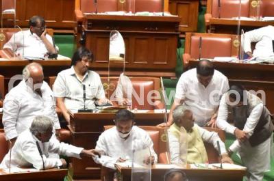 Photo Caption : Ministers ST Somashekar, Sudhakar and BJP MLAs during Assembly Session at Vidhana Soudha, in Bengaluru on Thursday 4th February 2021
