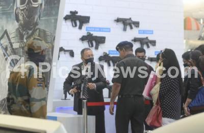 Photo Caption : People check out weapons at an exhibition stall on the last and third day of the Aero India 2021 at Yelahanka air base, in Bengaluru on Friday 5th February 2021