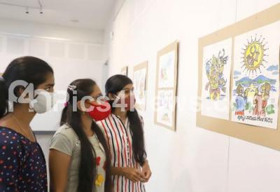 Students looking at Cartoons exhibition during Cartoons camp and shows organised by Health and Family Department at Chitrakala Parishat, in Bengaluru on Saturday 6th February 2021
