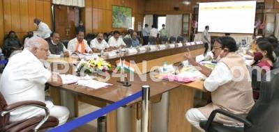 Photo Caption : CM BS Yeddyurappa with Ministers KS Eshwarappa, Prabhu Chauhan, Decentralization Committee Chairman Pramod Hegde, Planning Department Chief Secretary Dr Shalini Rajneesh during a meeting on Karnataka State Decentralisation Planning and Development Committee at Home office Krishna, in Bengaluru on Saturday 6th February 2021