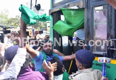 Photo Caption : Farmers being detained by Police personnel during their protest at Yelahanka highway junction during the nationwide Chakka Jam, in support of farmers agitation against the Central Government farm laws, in Bengaluru on Saturday 6th February 2021