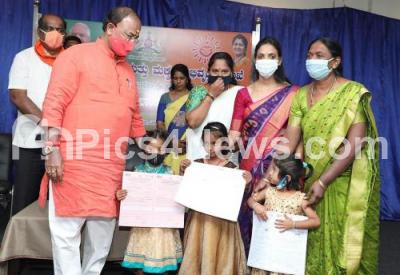 Minister of Forest, Kannada and Culture Arvind Limbawali distributed the Bhagyalakshmi Bond to the beneficiaries at a ceremony held at Maruthi village in Mahadevapura Assembly constituency, in Bengaluru on Thursday 11th February 2021