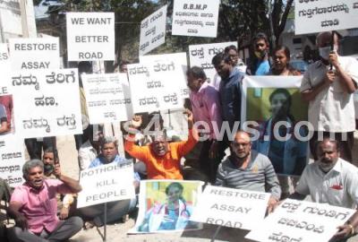 Members of Bharatinagar Residents Forum protesting against the negligence of BBMP and demanding early completion of all pending road works, in Bengaluru on Sunday 14th February 2021