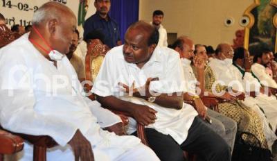 Photo Caption : JDS Supremo and Former PM HD Devegowda seen with Former CM HD Kumarswamy and other JDS leaders at the JDS Conference, in Bengaluru on Sunday 14th February 2021