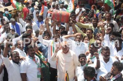 Photo Caption : Pulakeshinagar ward Congress workers led by MLAs Ramalinga Reddy and Akhanda Srinivas protest against Central BJP government for hike in fuel and LPG prices, in Bengaluru on Monday 15th February 2021